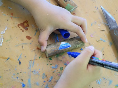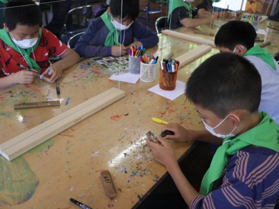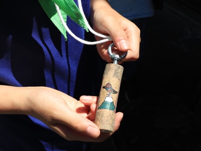 クラフト体験のもう一つのコースは、バードコール作りです。ナイフで木を削り、絵を描きます。