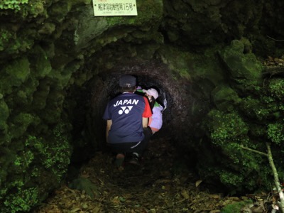 最後はこんなに細いところから出てきました。元々は倒れた木なので先端の方は細くなっていたということです。頭をぶつけないように気をつけて、這って出てきました。