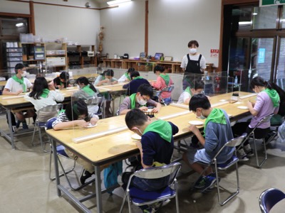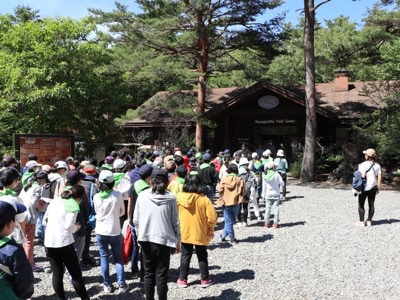 移動教室最後のプログラムは、河口湖フィールドセンターでのネイチャーガイドウォークと、クラフト体験です。ここでも、半分ずつに分かれて行います。