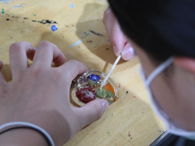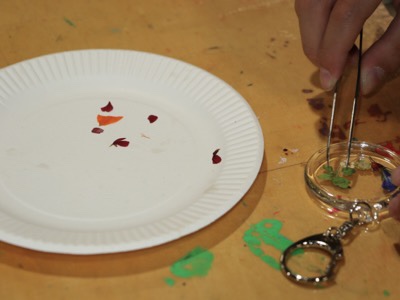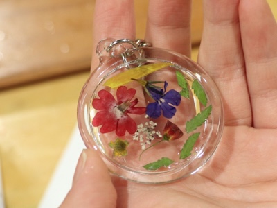 ネイチャーガイドウォークの裏で、残り半分はクラフト体験をします。クラフト体験にも2つのコースがあり、こちらは押し花のキーホルダー造りです。