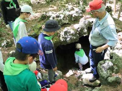 ネイチャーガイドウォークでは、樹海に点在する「溶岩樹型」などを見て歩きます。溶岩樹型とは、富士山の溶岩が木を包み込んで、中の木が燃えて無くなった後の穴のことです。