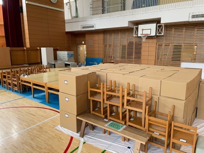1万冊余りの蔵書は、段ボール箱に詰め、テーブルや椅子とともにアリーナに積み上げました。このあと業者さんが運び出し、校外で保管されます。地下のこれまでの図書館は、更衣室とメモリアルルームに再度改装されます。