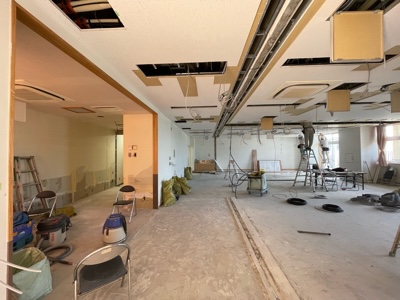 校舎内では、3-3・3-4を図書館に改装する工事が続いています。真ん中の部分が元の廊下で、左側は収納スペースになっていたところですす。3-3・3-4の教室の壁は全くなくなりました。今までよりも広い図書館のスペースが見え始めました。