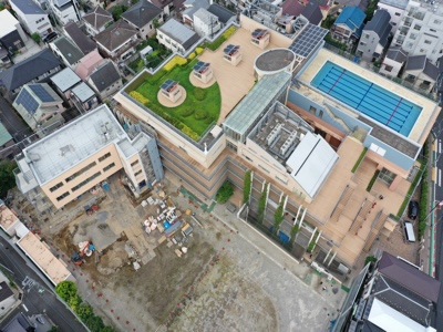 既存の校舎に、増築校舎が接続された様子がお分かりいただけるかと思います。増築校舎屋上は軽い運動ができるスペースになっています。8月1日からは校庭の再整備が始まります。