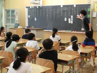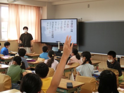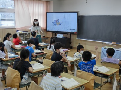 4-1です。デジタル教科書を液晶モニターに映して国語の学習が始まりました。