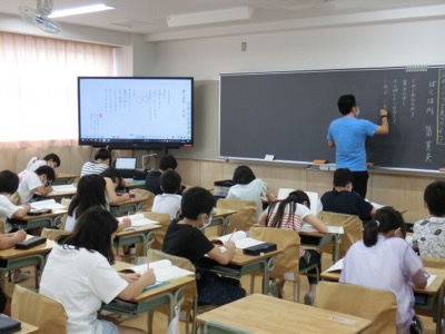 4-4も係を決めていました。4-4は新校舎「天2★」に移りましたが、天2★の教室には、液晶モニターの電子黒板が付いています。
