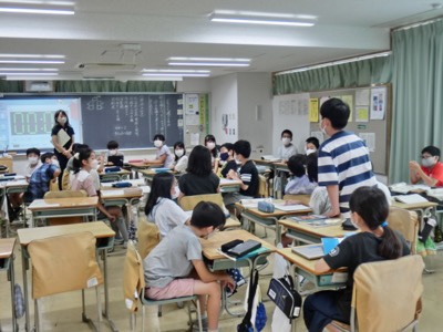 5年生は国語で「どちらを選びますか」という話し合いの学習をしています。立場に分かれて討論する、いわゆる「ディベート」的な活動です。今日は、「飼うなら犬がいいか猫がいいか」について話し合っていました。これほ5-1です。