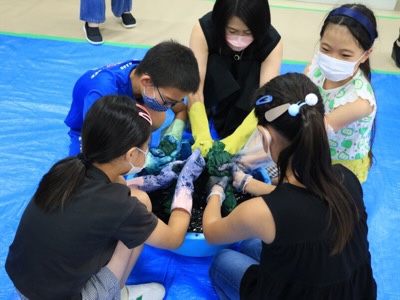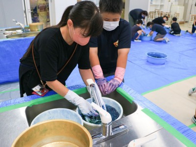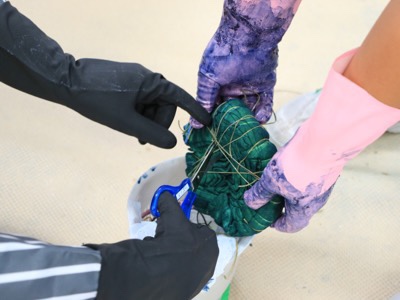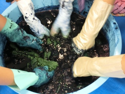 手が染まらないように、ビニール手袋をしていますが、藍が手に付いてしまった子もいました。