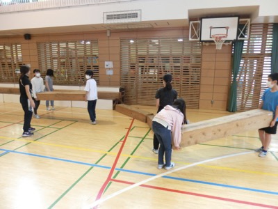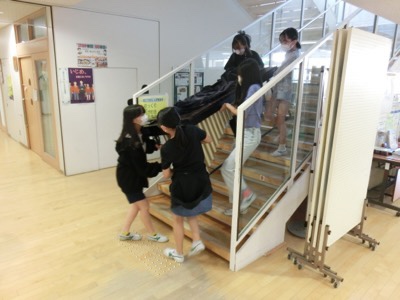 昼休みに6年生が音楽室から楽器をアリーナに運びました。