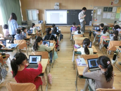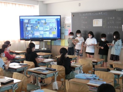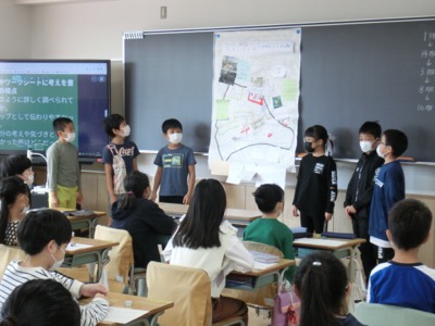 4年生の各クラスで、グループで調べてまとめた「地域安全マップ」の発表をしていました。これは4-1です。