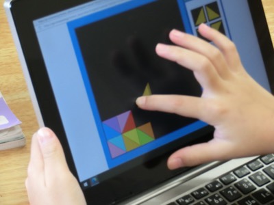 これは2-1の算数です。タブレットを使って、図形の敷き詰めをしていました。
