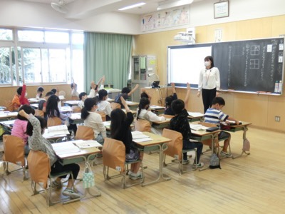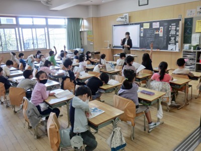 1-2の国語の授業では「学校にあるカタカナの言葉を集める」という活動をしていました。たくさん手が上がって「アリーナ」「チャレンジタイム」「タブレット」「オープンスペース」と、天沼小らしい言葉が出てきました。
