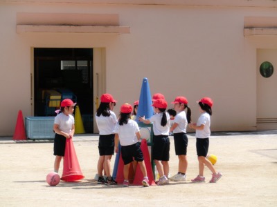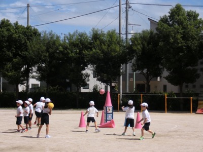 投げられたボールをブロックすることもできます。コーンが倒れた数で点数を競っていました。