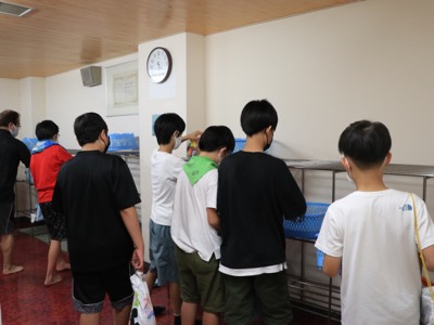 各部屋の生活係が集まって、弓ヶ浜クラブの方から寝具の敷き方、畳み方を教わりました。生活係の子どもが部屋に帰って班員に教えます。