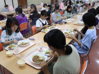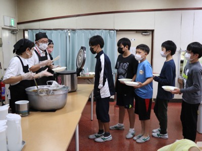 カレーライスのお代わりに行列。みんな元気です。