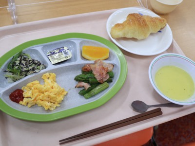 今朝のメニューは、スクランブルエッグ、コーンスープ、パンなどです。