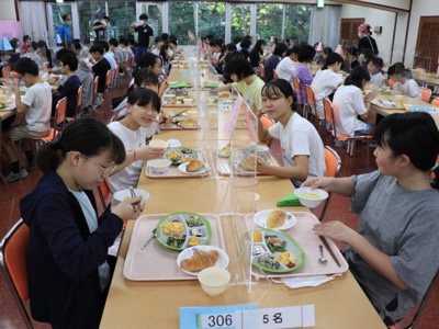 食事係が配膳した食堂の入口に班ごとに並び、全員そろったら消毒をして食堂に入ります。