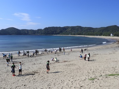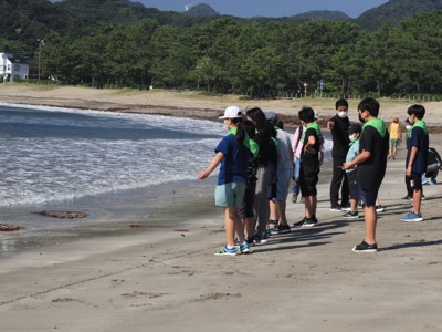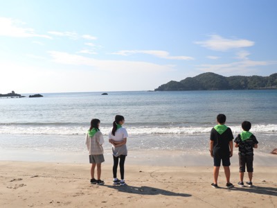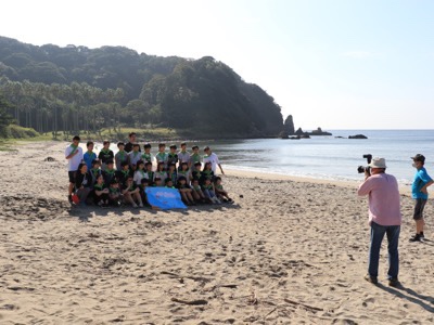 朝食を終えて、海岸へ写真撮影と砂遊びに出かけます。またもや集合時刻に間に合わず、岡田先生から指導がありました。そんなに無理な時間設定ではないのですが…