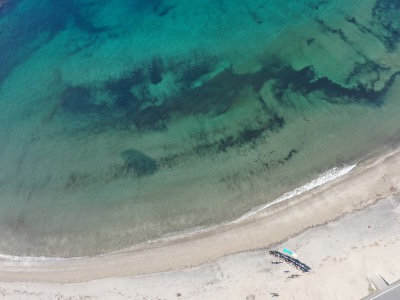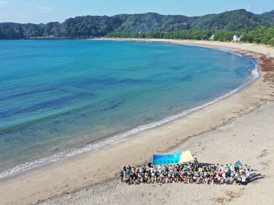 浜辺で全体集合写真を撮りました。いい天気だったので、写真屋さんが撮影している上から、ドローンで空撮しました。海が本当にきれいです。※国土交通省からの許可をを得てフライトしています。