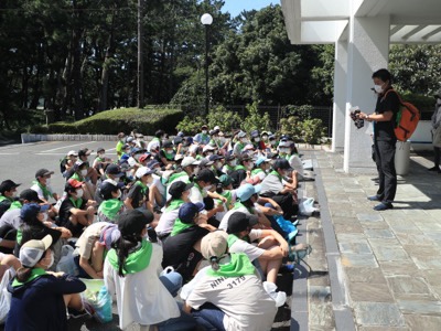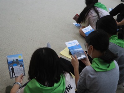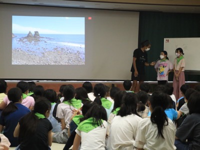 毎年、弓ヶ浜移動教室に行った6年生に「何が楽しかった?」と聞くと多くの子が「磯観察」と答える、弓ヶ浜のメインプログラムです。はじめに、ガイドの堀さん(キャプテン)から、レクチャーがありました。