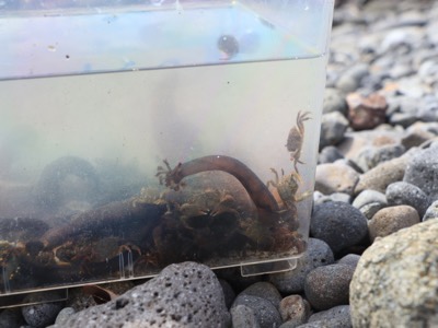 いろんな生き物が捕まえられました。長細いのはムラサキクルマナマコです。