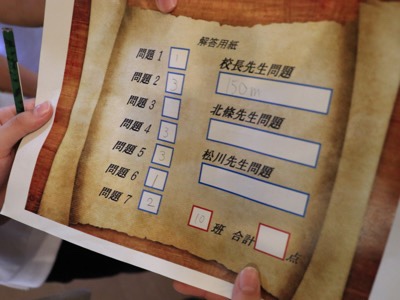 これがグループが持っている解答用紙です。7つの出題ポイントの他に、校長先生、北條先生、松川先生の問題もあります。