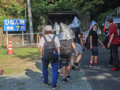 私の問題は、昨日の避難訓練のこの写真を見せて「避難した地点は海抜何メートルだったか」を答える問題でした。「300m!」…そんなに登ってません。
