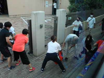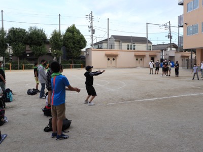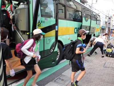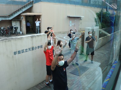 途中、渋滞があってようやく天沼小に到着。先生たちが待ち構えています。