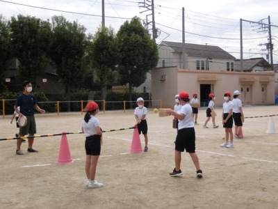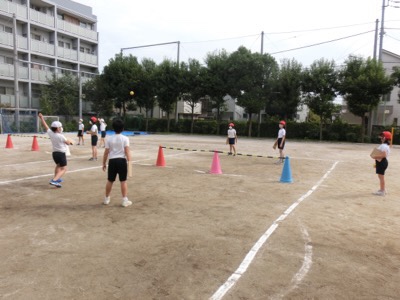 校庭では4-3が体育をしています。テニスのようなネット型の球技です。