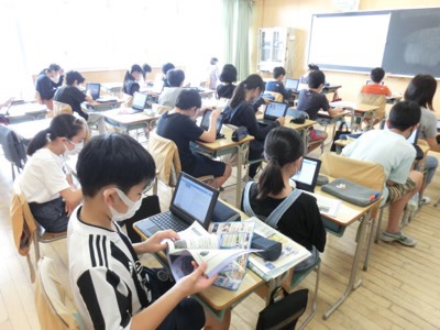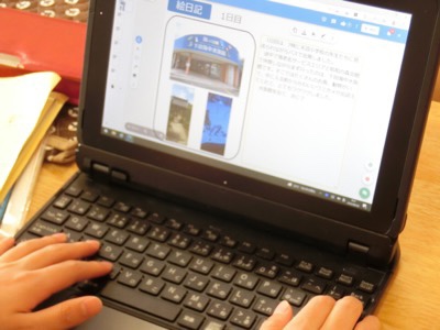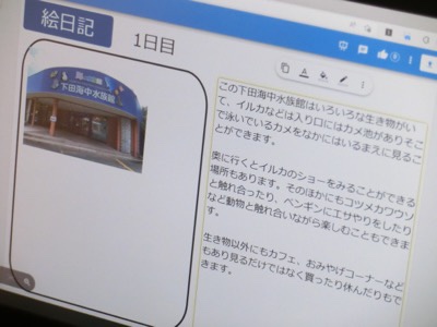 昨日移動教室から戻ってきた6年生が、弓ヶ浜移動教室の思い出をタブレットでまとめていました。これは6-1です。