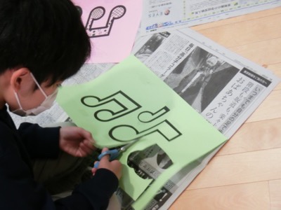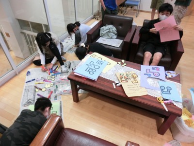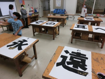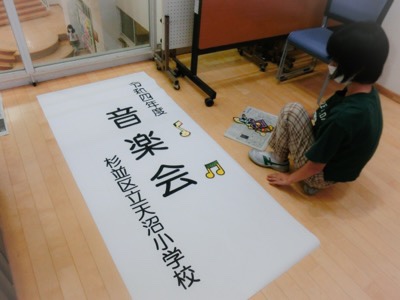 図工室では、会場に掲げるスローガンを書く係が活動していました。