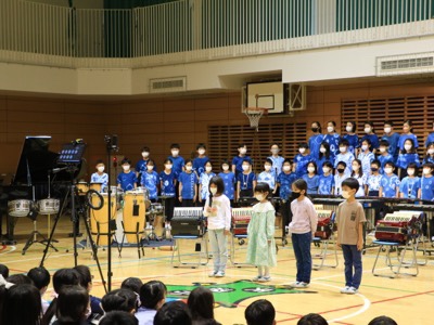 1年生は、国語で学習した「くじらぐも」より、合唱「まねっこまねまねくじらぐも」、合唱「そらのぼうけん」、合唱と合奏「いつまでも ともだち」を音楽劇のように演奏しました。