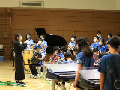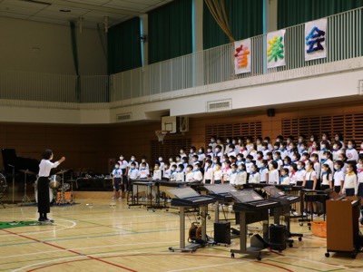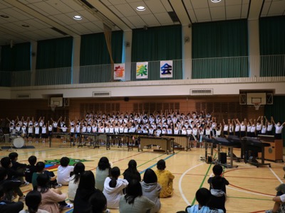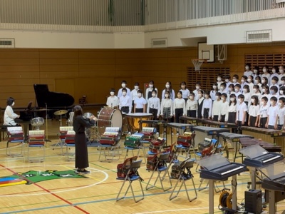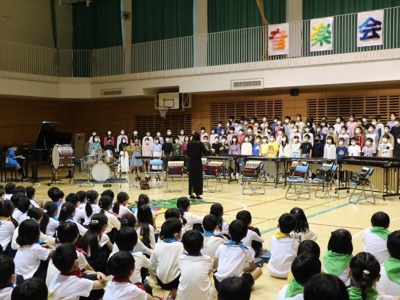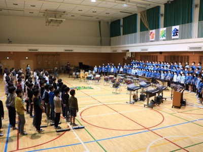 トリは6年生。合唱「いのちの歌」ではしっとりとした歌声を、合奏「ドラゴンクエスト ロトのテーマ」では迫力あるメロディを響かせました。
