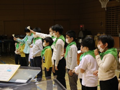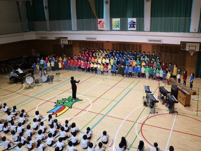 はじめに校歌斉唱をしました。今日は児童鑑賞日ですが、会場のアリーナには出演する学年とその次に出る学年だけがいます。その他の子どもたちは教室でオンライン鑑賞をしています。