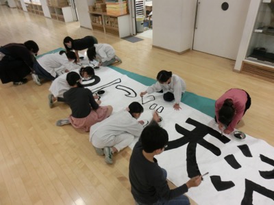 装飾係は図工室前でスローガンの横断幕を描いていました。