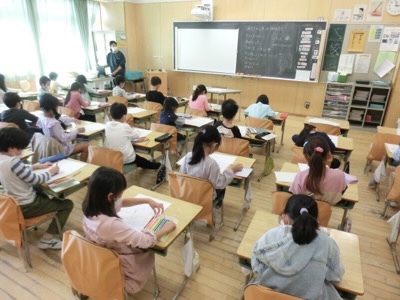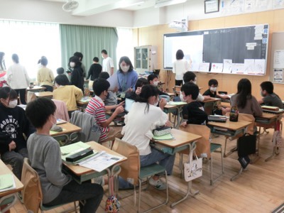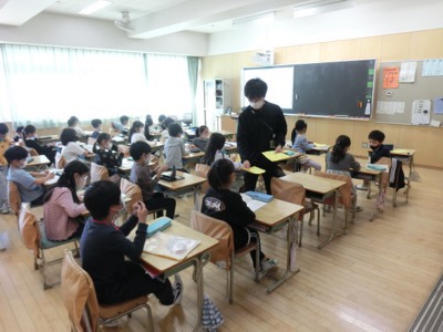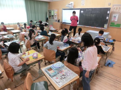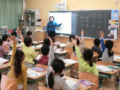 これは1-3の国語の授業です。漢字のなりたちについて学習していました。よく手が上がっていますね。