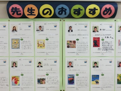図書館の外には、読書旬間の企画で、先生たちのおすすめの本が紹介されていました。
