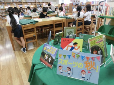 体育発表会前なので、スポーツに関する図書がテーブルに展示されています。