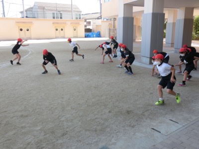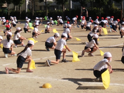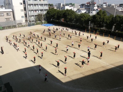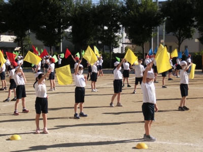 体育発表会まであと1週間。2年生が校庭でフラッグを使った練習を続けています。
