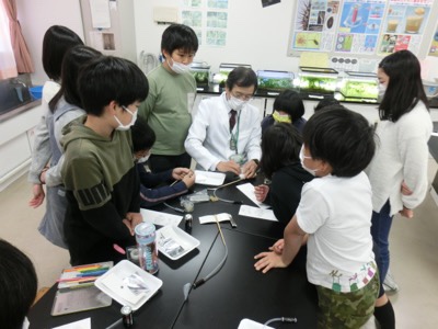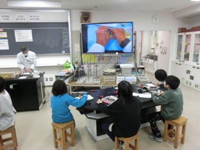理科室で5-3が、理科出前教室の授業をしていました。杉並区立済美教育センターの理科指導員の先生が学校に来て、実験を指導してくれるありがたいシステムです。