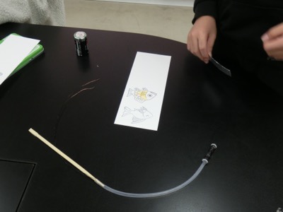 「マイ魚釣り」は、電磁石オンでクリップの付いた魚を釣り上げ、電磁石オフで離す仕組みです。理科指導員の先生が丁寧に指導してくれます。