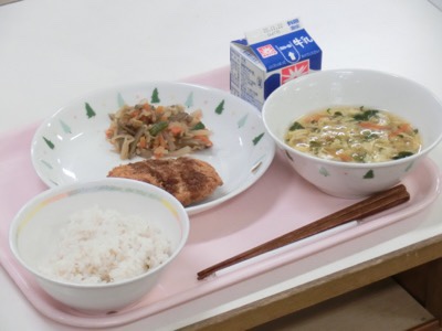 献立や調理の実態などを説明したあと、今日の給食を試食しました。今日は、里芋コロッケ、切り干し大根の煮付け、かき玉汁、ごはん、牛乳です。