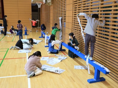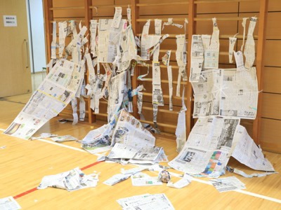 壁と平均台を使ってジャングルのように新聞紙を貼っていきます。