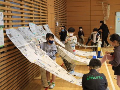 新聞紙を「つる」のように繋いでジャングルを作ろうという造形活動です。