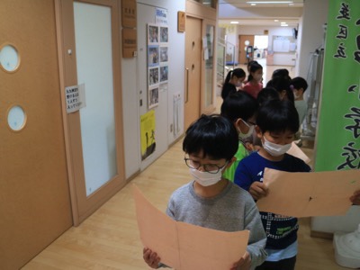 校長室前の廊下に、2年生が行列を作っています。授業でかけ算九九を学習したあと、全て暗記して九九が自由自在に使えるようになったかどうか、校長室に検定を受けに来るのです。