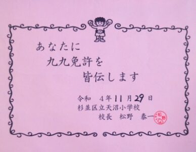 私が出題する九九の問題に全て答えられると、検定は合格。「九九免許」に印をもらって嬉しそうに帰っていきます。今日から始まった九九検定、全員が合格するまで校長室でお待ちしています。