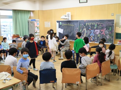 これは2-1のお楽しみ会の様子です。椅子取りゲームや、なんでもバスケットなどをしていました。