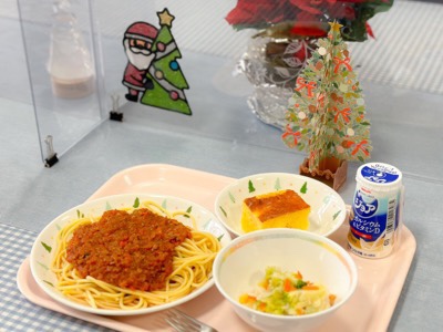 そして、今日は2学期最後の給食です。子どもたちの好きなスパゲティミートソースと、ケーキも付いていますね。