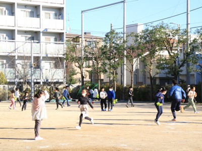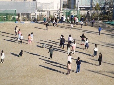 今日、お楽しみ会的な活動をしているクラスもあります。3-1と3-3は合同で校庭で遊んでいました。だるまさんがころんだをしたり…