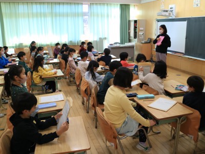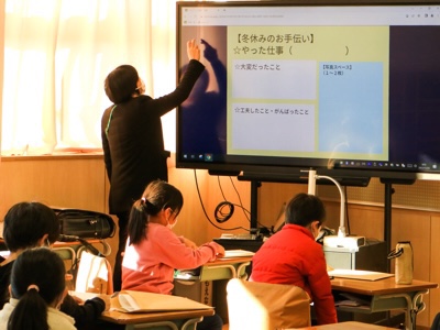 4-4では、冬休みにするお手伝いをまとめるシートの説明をしていました。お手伝いの種類、頑張ったこと、大変だったことなどを書き込みます。